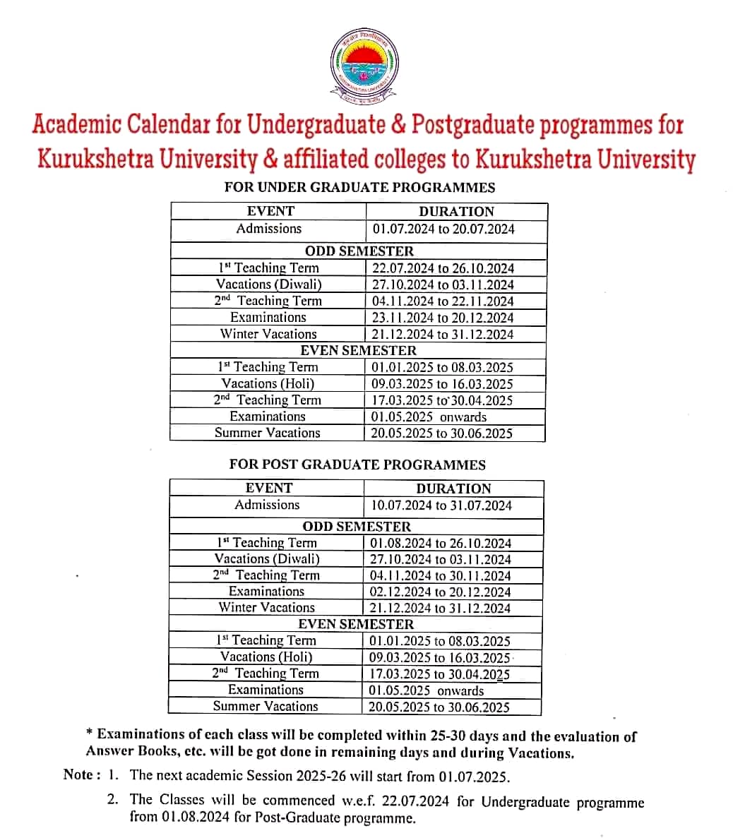 Kuk Academic calender for ug and pg courses 2024-25 Download